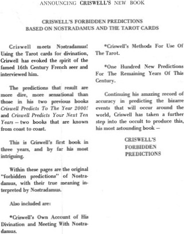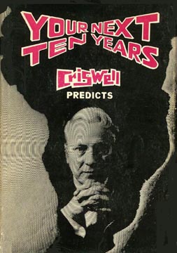 In 1968, Criswell wrote his first book: "Criswell Predicts: From Now To The Year 2000!"; this book was Criswell's "Journal of the Future". It contained hundreds of predictions covering the next 30 years. Readers were asked to "keep score" on the accuracy of his predictions-- until, as Criswell predicted, August 1999, "after which it will not matter." Click here to see some of his predictions from this book. His second book "Criswell Predicts Your Next Ten Years!" was released in 1969. "Why should you feel lonely when you have a trillion counterparts?" Criswell admonishes the reader in his foreword to Your Next Ten Years. "Do the other trillion feel as lonely as you? Are you fair to them?" This work is a combination of fashion tips, financial forecasts, amazing labor-saving devices, spicy gossip and gloomy tales of impending social collapse. In 1972 Criswell released his 3rd and final book "Criswell's Forbidden Predictions: Based on Nostradamus and the Tarot". Read the book release article - courtesy of Jacob Allan Chapman (AMysticSeer). Around 1970 Criswell released "The Legendary Criswell Predicts! Your Incredible Future" from Horoscope records. This rare vinyl record album contained many scarifying predictions. Including: "I predict the day of severity in dress will soon be at hand, almost Puritanical in style, with no beads, no jangles, no bracelets. Men and women will wear exactly the same makeup, the same style of hair dress, and, if required, the same type of wig. I was not allowed to say on television, radio, or have it appear in my column, as the advertisers would clomp down on me, and clomp very heavily." He was portrayed by actor Jeffrey Jones in the biopic Ed Wood (1994), in which it is suggested that Criswell was simply a showman and never claimed to be a real psychic. However, those who knew him, such as actress and fellow Plan 9 alumna Maila Nurmi ("Vampira"), have disputed this. Also, according to writer Charles A. Coulombe, whose family rented an apartment from the psychic, Criswell told Coulombe's father "[I] had the gift, but … lost it when I started taking money for it." Whereas the End of the World did not