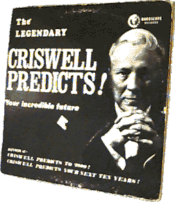 ![]() Known by his stage-name The Amazing Criswell, he was famous for his wildly inaccurate predictions. Criswell, was born Jeron Charles Criswell King, on Sunday, August 18th, 1907, in Princeton, Indiana. Criswell went to high school, and did some newspaper work for the local paper; later he attended the University of Cincinnati, studying at the Conservatory of Music. Criswell returned to newspaper work, and made more and more predictions, having his forecasts printed in more and more papers. Over the years, an ever-increasing number of people followed his syndicated columns. Here is a rare scan of one of his columns - courtesy of Jacob Allan Chapman (AMysticSeer). Criswell married an eccentric former speak-easy dancer, named Halo Meadows (she appeared on an episode of "You Bet Your Life" with Groucho Marx). His wife spent a great deal of time sunbathing; she also had a poodle named "Buttercup" which she was convinced was the reincarnation of her cousin Thomas. Criswell was longtime friends with actress Mae West, once predicting her impending rise to the position of President of the United States, whereupon she, Criswell and George Liberace, the brother of showman Liberace, would ride a rocket to the moon. West used Criswell as her personal psychic, as well as lavishing him with gifts of home-cooked food, dropped off via chauffeur. Additionally, West was known to sell Criswell her old luxury cars for $5. For her 1955 album The Fabulous Mae West, she recorded a song about the psychic, titled, appropriately enough, "Criswell Predicts". Criswell was a flamboyant figure, best remembered for his spit-curled hair, his stentorian speaking style, and his sequined tuxedo. He was the possessor of a coffin, in which he claimed to sleep. 87% of Criswell's predictions have come true! (The ones he reminds you of.) Whereas it is true Criswell made the amazing forecast (on the Jack Paar TV special, March 10, 1963): "I predict that President Kennedy will not run for reelection in 1964, because of something that will happen to him in November 1963" -- Criswell also predicted... the destruction of Denver, shifting polar caps, Castro's assassination, and the End of the World. As Criswell's fame grew, he appeared a number of times on Johnny Carson's "Tonight Show"; on December 31, 1965, Criswell predicted that Ronald Reagan would be California's next Governor.